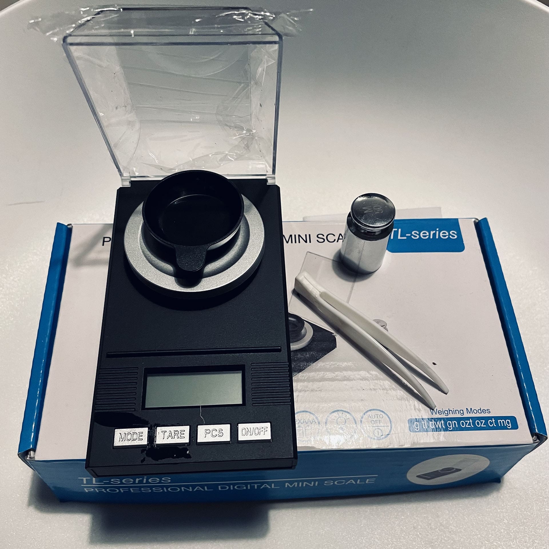 Medföljer: 1x 50-grams kalibreringsvikt, pincett & 1x extra vågskål för små objekt.